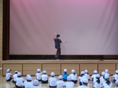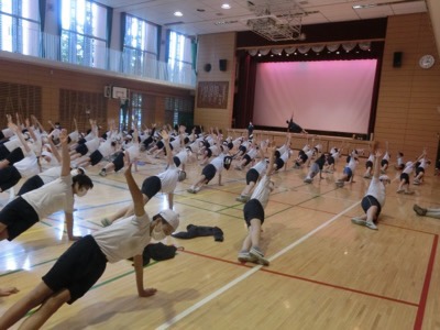 アリーナで5年生が、運動会で踊る「エイサー」の練習をしていました。担任の岡田先生がお手本を見せています。
