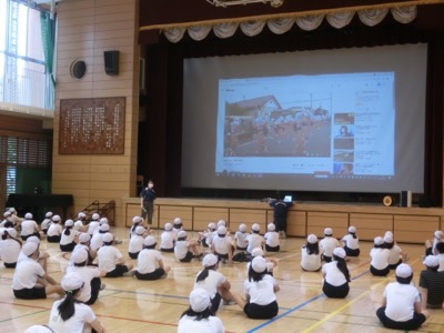 続いて次の時間には6年生が運動会の練習です。日本各地の民舞をビデオで見て、動きを学んでいます。