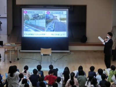 身の回りの場所でどんなところに危険が潜んでいるかを、写真をもとにお話をしてくださいました。今後、実際の安全マップ作りに生かしていきます。