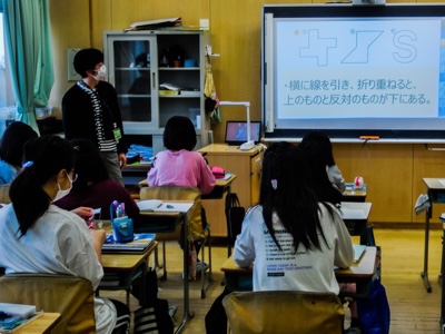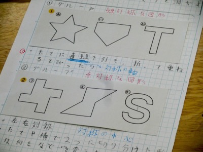 こちらの教室では、子どもたちが対称な図形をかいて説明しています。
