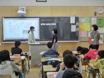 続いて、5-3の英語の授業です。誰か前に出て会話をしてくれる人は?