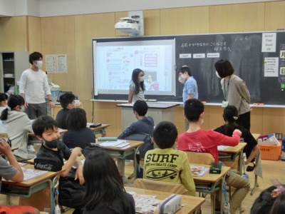 担任の西川先生、JTE(日本人英語指導助手)のギベス先生が見守る中、英語での会話が続きました。