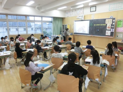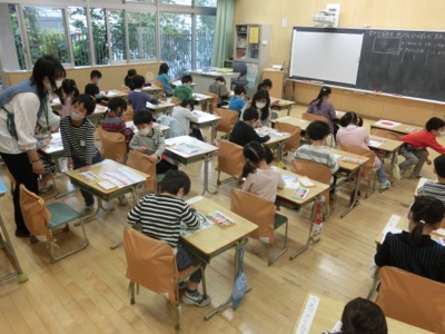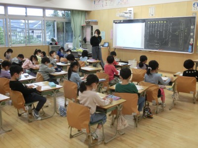 1-1も国語の授業です。ひらがな「き」のつく言葉をノートに書いています。まだ1か月しか経っていない1年生が、きちんと背筋を伸ばして学習をしていますね。
