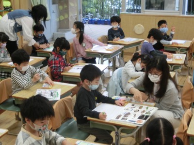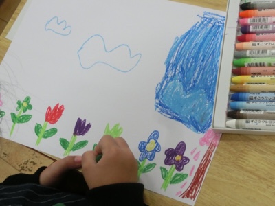 好きなものを画用紙いっぱいに大きく描く、という指示を聞いて、楽しく描いていますね。