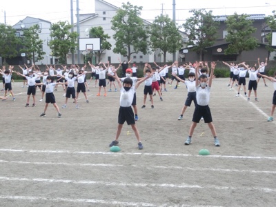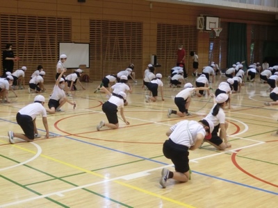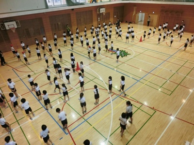 運動会の練習、今日は3年生から。アリーナで、まず最初の隊形に並んでいます。このあと…