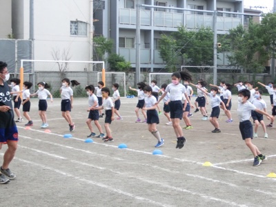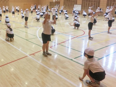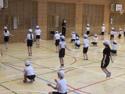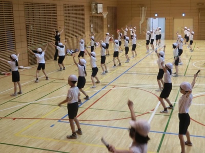続いて4年生です。4年生は最初、校庭に出ようとしていたのですが、雨が降ってきてアリーナに変更になりました。ダンス冒頭の、縄を二人で持つところからです。