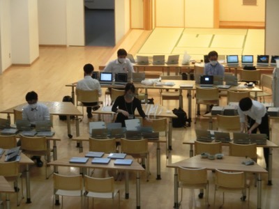 これまで天沼小で使ってきた400台以上のタブレットを外部ネットワークに接続できる設定に変えるため、今日も業者さんが作業を進めていますが、全部終わって持ち帰れる設定になるのは六月末ごろになりそうです。