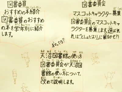 図書委員会では、おすすめの本紹介、マスコットキャラクターの募集、図書館の使い方説明などの取組をしています。