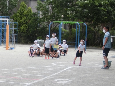 校庭ではソフトボール投げをします。うまく投げられずに目の前に叩きつけてしまう子もいて、なかなか遠くに投げるのは難しいようです。