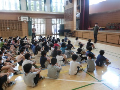 5年生が、水泳指導の前にアリーナで「プール開き」をしています。学年全体でプールに行けないため、ここで実施することにしました。