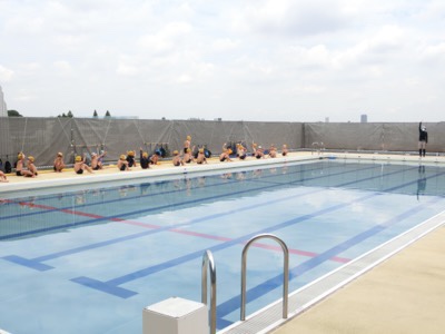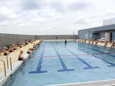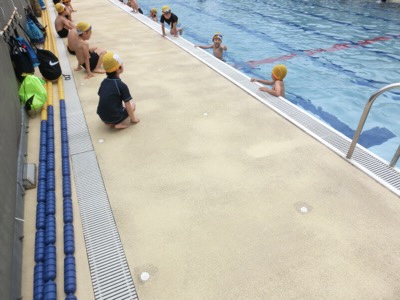 プールサイドには、子どもたちが間隔を空けて並ぶ目安になるように、白いマーカーを塗りました。