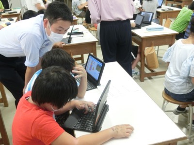 担任の大中先生がアドバイスをしてくれます。全員がScratchを使いこなしてプログラミングをしている様子に、見ていた先生たちも驚いていました。