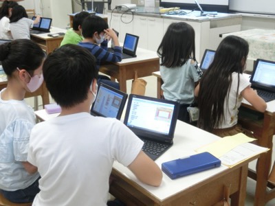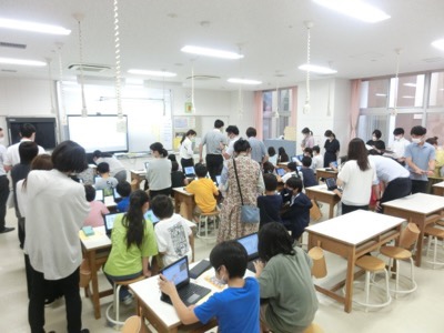 今日は4-1がプログラミング教育の研究授業を行いました。研究授業というのは、先生たちが授業を見て指導法について学ぶ研修のやり方の一つです。