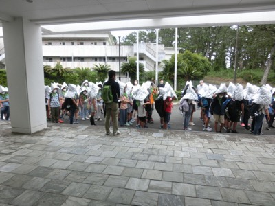 最初に避難訓練をすることになっています。津波が来た時のために、裏山の上まで避難する訓練を行いました。