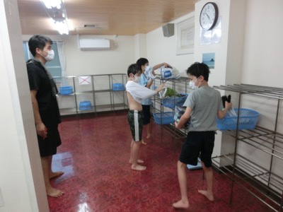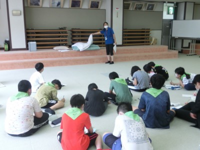 各班の生活係が、弓ヶ浜クラブの方から寝具の扱いについて説明を受けました。メモを取って、部屋に帰ってみんなに説明します。