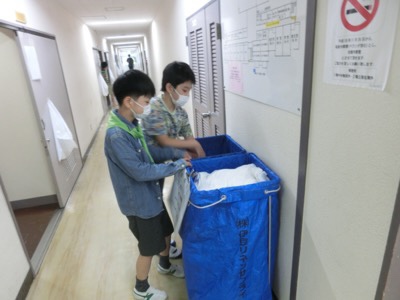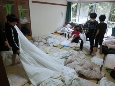 これまでの移動教室では、生活係がシーツをまとめて片付けていましたが、今回は感染防止のため自分で使ったシーツやカバーは自分でリネンボックスに片付けます。