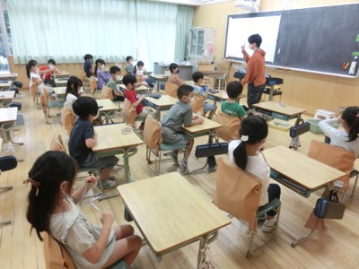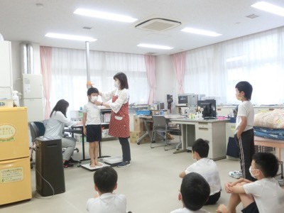 保健室で4年生が身体測定をしていました。夏休み中に背が伸びたかな。
