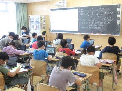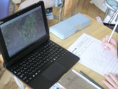 学級園にタブレットを持って行き、撮った写真を見ながら観察カードをかいていました。このように、デジタルとアナログを組み合わせて学習を進めています。
