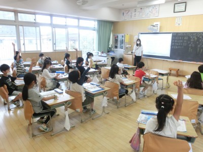 1-1の算数です。2桁の数が10といくつに分かれるかを考えていました。よく手が上がっていますね。