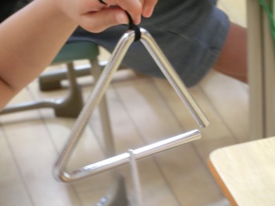 1-3は講師の會田先生の音楽です。トライアングルの演奏の仕方を教わっています。