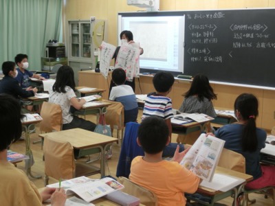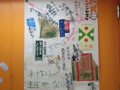 教室の外には、米の主な生産地を米袋の表示を貼り付けた地図で表していました。このように、自分たちの生活と結びつけて社会科の学習を進めていくことが大切です。