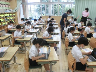 一人一人がログインするのですが、1年生はキーボードで自分のパスワードを入れるのも一苦労。ICT支援員さんが細かくサポートしてくれます。こうして慣れていくことで、学習の道具としてだんだん使えるようになっていくのです。