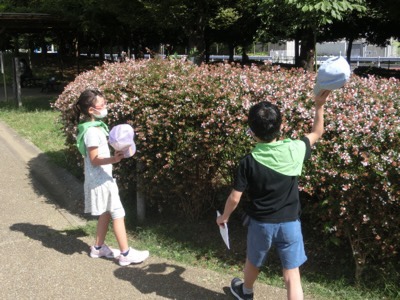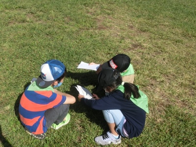 この子たちは、調べて描いた絵と比べながら草を探していました。