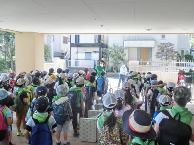 2年生がピロティに集合しました。これから桃井原っぱ公園に出かけます。生活科で秋を探すこと、そして今度、1年生を連れて行く時の下見を兼ねています。