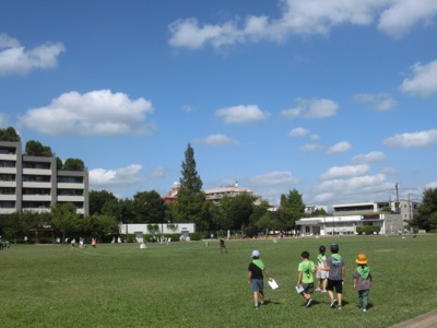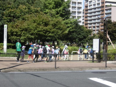 約30分で桃井原っぱ公園に到着。かなり早く歩くことができました。緑色のシャツを来た学校支援本部(AW)のみなさんが付き添ってくれました。