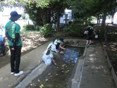 水路でちょっとだけ水遊び。AWさんが安全管理の見守りをしています。