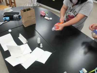 これは科学クラブです。今日は、ペットボトルとゴム風船で「空気砲」を作っていました。