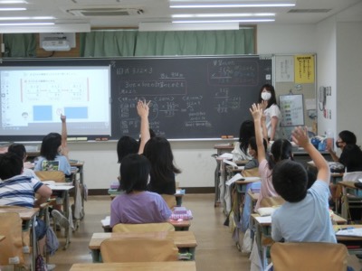 3-2の教室では習熟度別の少人数算数の授業でした。3桁×1桁の計算の仕方を考えて発表していました。