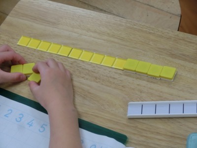 ブロックを並べて、どちらがどれだけ多いか比べていました。