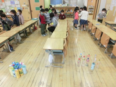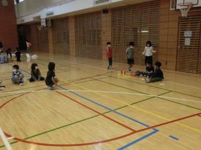 自分たちで試しに遊んでみて、ちょうどよいスタート位置を決めたり、係の仕事の練習をしたりしていました。