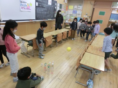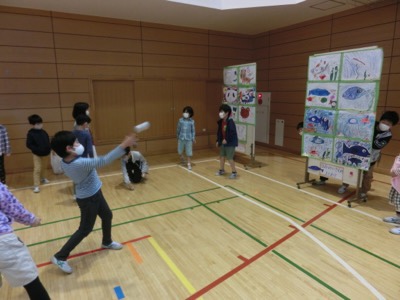 アリーナでは、2年生もあまぬままつりの練習をしていました。2-2は「まとあて」をするようです。