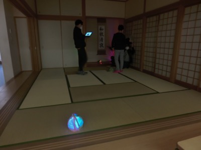 完成したランプシェードの中にLEDランプを入れて、タブレットで写真を撮っています。展覧会の共同作品として画像を映すようです。