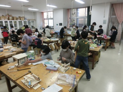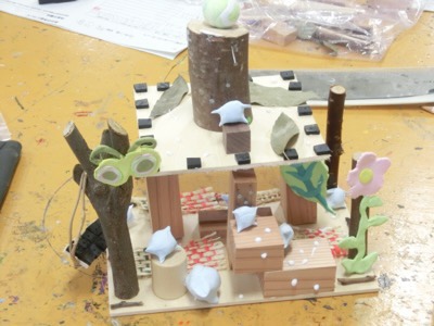 図工室で4-2が「ひみつのすみか」という立体作品を作っていました。