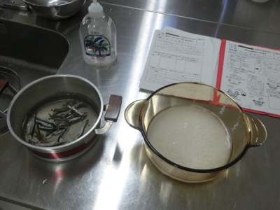 お米を研ぎ、煮干しの頭を取ったものを鍋に入れて出汁を取ります。