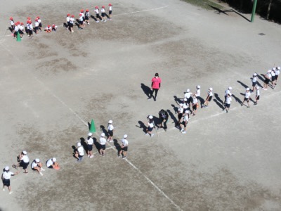 4階から校庭を見下ろすと、1年生がなわ跳びフェスティバルで長縄をしていました。