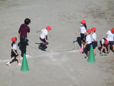 中学年や高学年の流れるような8の字跳びはできませんが、ここから始めていくときっと跳べるようになるでしょう。