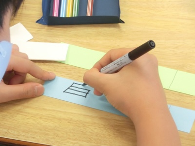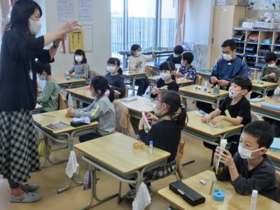 2-1は、おもちゃ作り。地域の講師の先生が、牛乳パックを使ったカスタネットの作り方を教えてくれました。