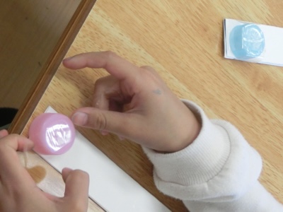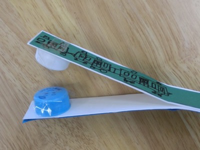 細く切った牛乳パックに貼り、そこにペットボトルキャップを貼り付けます。