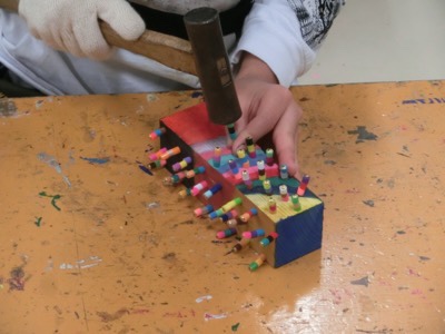 木片に釘を打ってハリを表現します。おしゃれなハリネズミなので、釘にビーズを通しています。