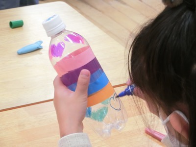 ペットボトルにテープを巻いたり、模様を描いたりして飾ります。