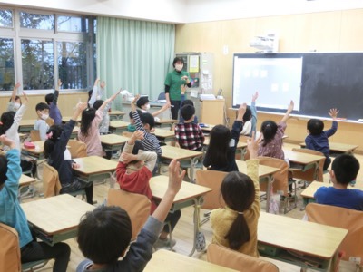 1-4は国語の授業です。漢字のなりたちについて考えていました。よく手が上がっていますね。