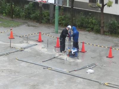 雨の中、校庭ではフェンスの柱を打ち込む作業が続いていました。