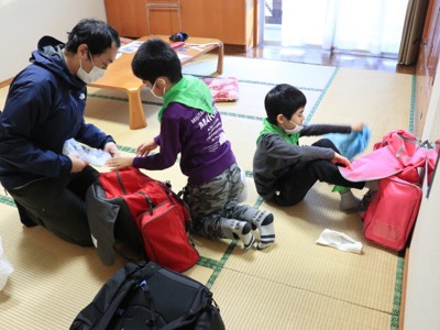 大きなリュックに入れてきた荷物を整理して、入浴の準備をします。