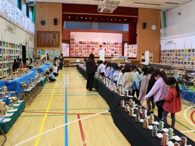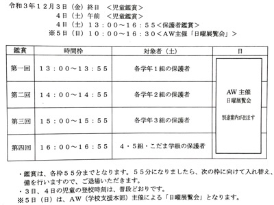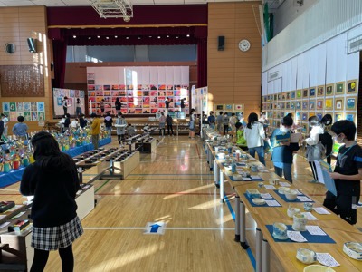 明日の午後は保護者鑑賞日です。コロナ禍の感染防止のため、時間を区切って人数を制限しての入場になることをご了解ください。学年で区切るとその学年の展示に集中してしまうため、クラスで区切っています。