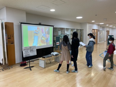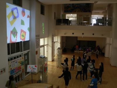 エントランスには、製作中の画像がスライドショーで映写されています。6年生が音楽の時間に作詞作曲したBGMが流れます。