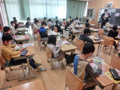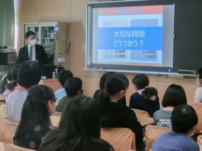 5年生は、携帯電話会社の方が来てくださり、スマホやSNSの使い方で気をつけることを教えてもらいました。